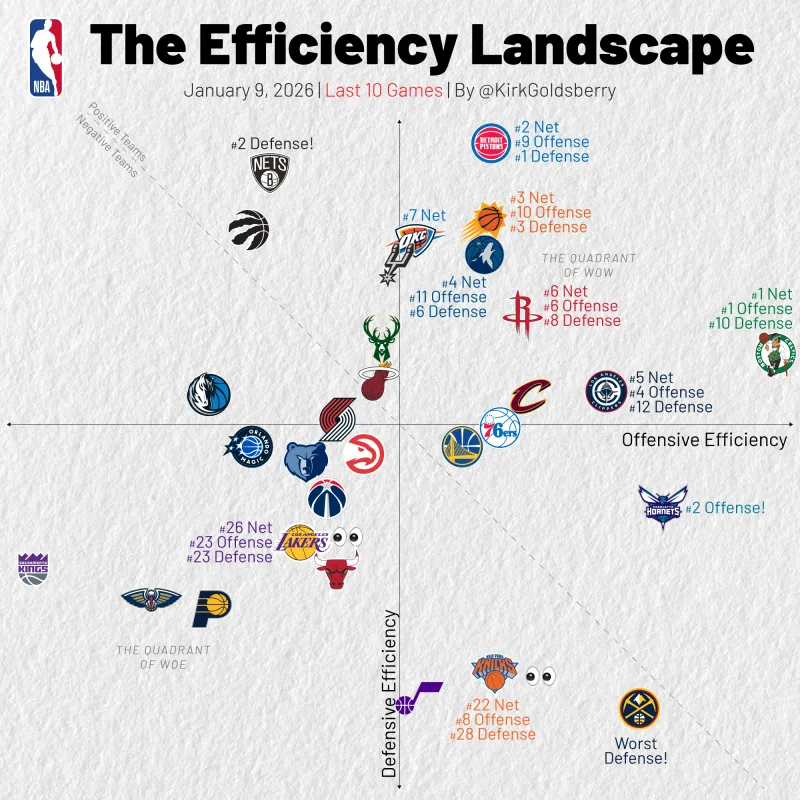 虎扑01月09日讯 美记Kirk Goldsberry制图晒出近10场联盟攻防效率图。