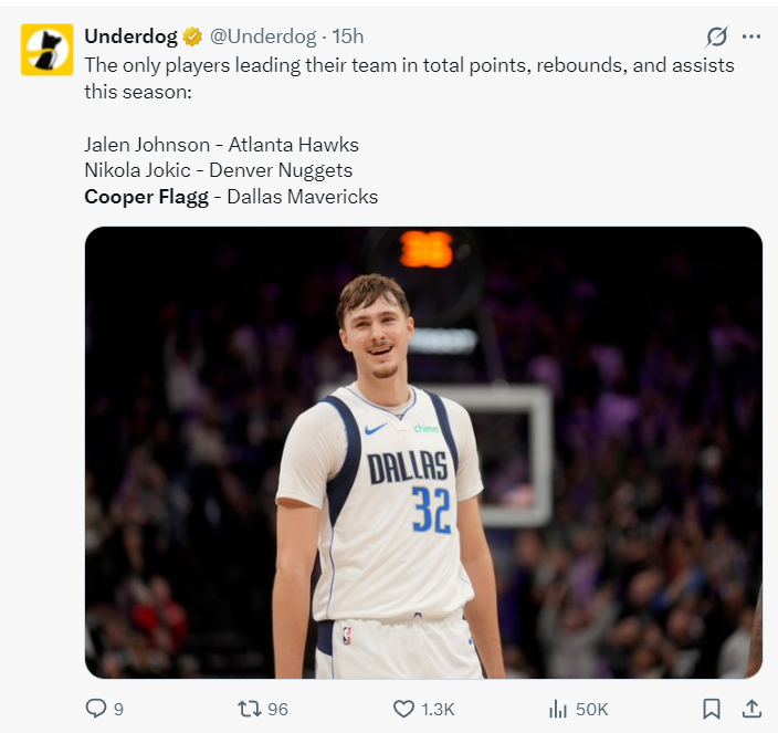 6.目前联盟只有三人得分、篮板、助攻都是球队最多:约基奇、杰伦-约翰逊、弗拉格;