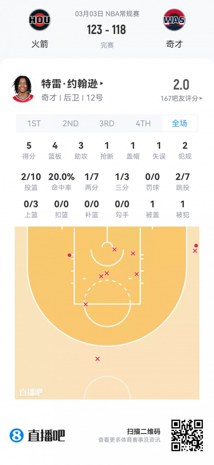 奇才首轮6号秀特雷·约翰逊 登场21.5分钟