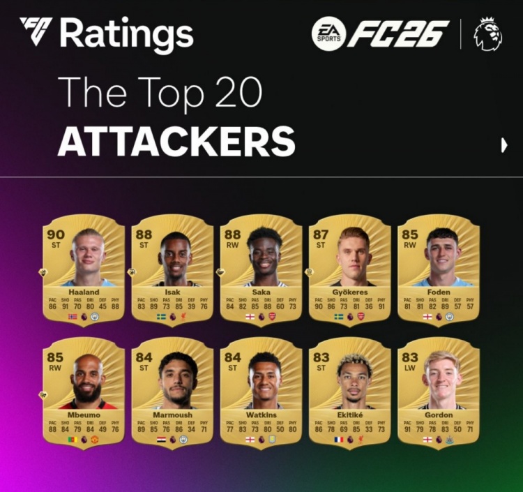 9月9日讯 EA官方公布了FC26英超攻击手评分榜,其中哈兰德居首,具体如下: